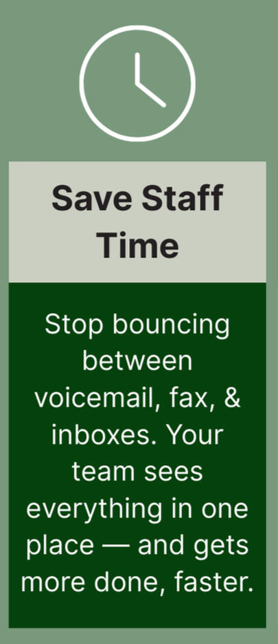 Communication consolidated to ONE platform—no more jumping between fax, voicemails, EHR messages, and portals.